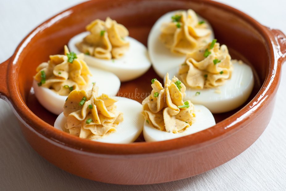 Jaaaa, nog een gevuld ei! Dit is mijn favoriete basisrecept waarmee je eindeloos kunt variëren. Zo voeg ik vaak nog extra fijngesnipperde sjalot, ham, zalm, viskuit, fijngeprakte ansjovis, of Hollandse garnaaltjes aan de vulling toe. Tip: je kunt de eitjes prima al een dag van tevoren maken en in een afgesloten bak in de koelkast bewaren.