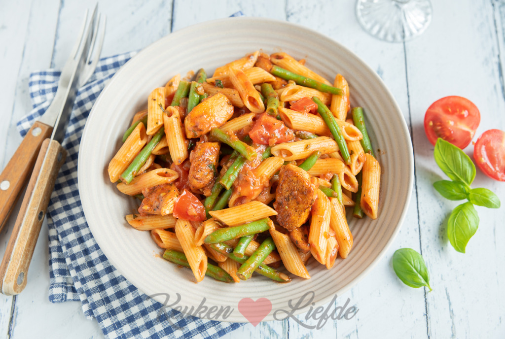 Deze kipfilet Toscane ken je misschien van de bekende pakjesfabrikant, maar je maakt hem zelf nog lekkerder! Een heerlijk pastagerecht met gekruide kip en smakelijke tomatensaus met sperziebonen en tomaatjes. Heel makkelijk om te maken!