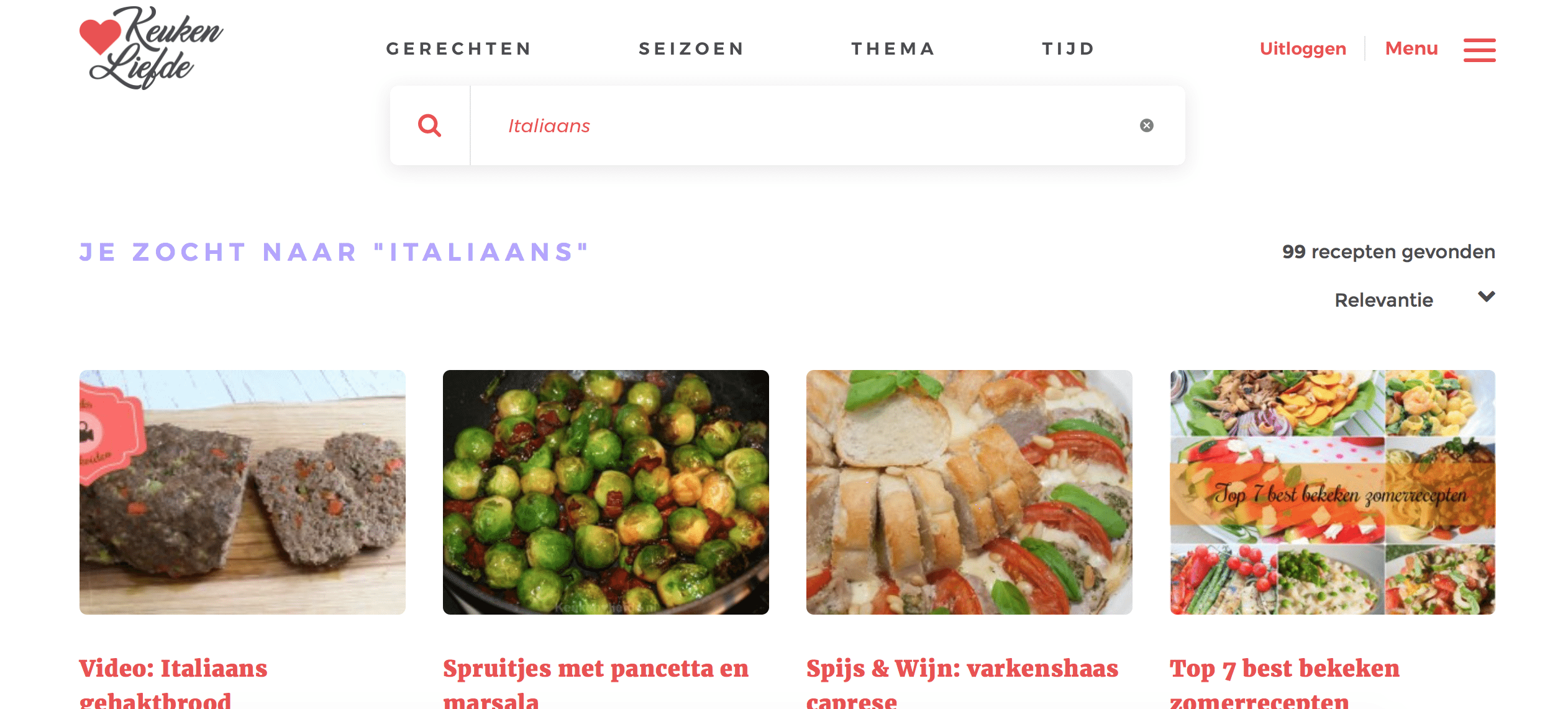 Het liefst eet ik elke dag Italiaans. Lasagne, spaghetti, pizza: ik kan er geen genoeg van krijgen! Op KeukenLiefde vind je inmiddels 99 Italiaanse recepten. Je kunt ze het snelste vinden door in de zoekbalk op de homepage ‘Italiaans’ in te tikken. Zie het voorbeeld hieronder.