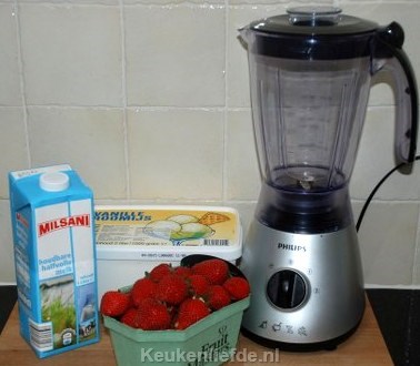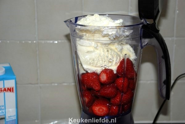 Doe het ijs, aardbeien en een scheutje melk in de blender en pureer het geheel tot een romig mengsel.