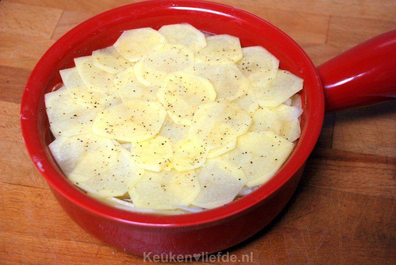 Schil ondertussen de aardappels en snijd ze in flinterdunne plakjes. Leg de aardappels en uien in laagjes in de ovenschaal, bestrooi steeds iedere laag met zout en peper, en eindig met een laag aardappels.