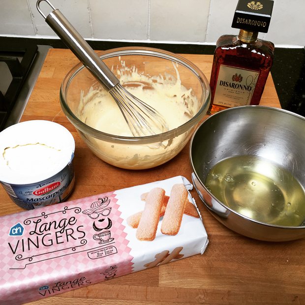 Mijn vader is morgen jarig en dat wordt natuurlijk gevierd met een gezellig etentje. Ik maak het toetje: een grote schaal tiramisu! Het verjaardagsdiner is morgen pas, maar zo kan hij alvast lekker opstijven. Na een nachtje in de koelkast smaakt -ie namelijk nóg lekkerder! Het recept komt eraan!
