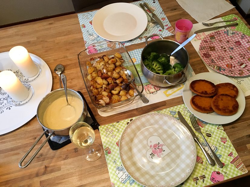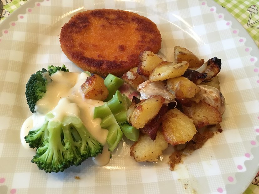 ’s Avonds eten we geroosterde aardappels uit de oven, gekookte broccoli, zelfgemaakte kaassaus en gebakken kipschnitzels. Simpel en heel erg lekker!