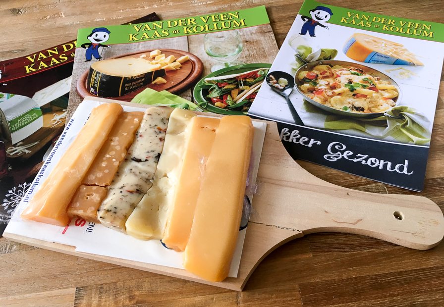 Ik krijg allemaal lekkers thuisbezorgd: dit heerlijke kaasplankje krijg ik van Kaas uit Kollum: een familiebedrijf gevestigd in het Friese dorp Kollum. Op het plankje ligt Onze belegen, Oud, Tynjethaler, Boerenkaas met grove olijf en tomaat, oude Brokkel en Veenlight Exclusief. De Tynjethaler kende ik al (die is echt heerlijk!), de andere kaasjes nog niet. Ik bewaar de kaasjes voor zaterdagavond, om samen met Johan van te genieten.