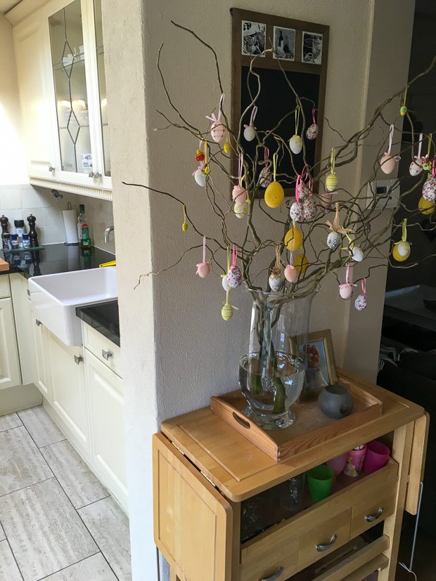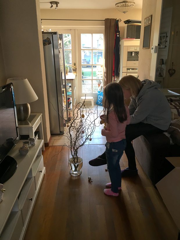 El en ik versieren de paastakken die ik van mijn moeder heb gekregen. Dat staat weer zo gezellig!