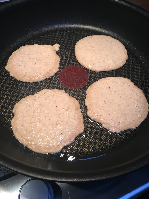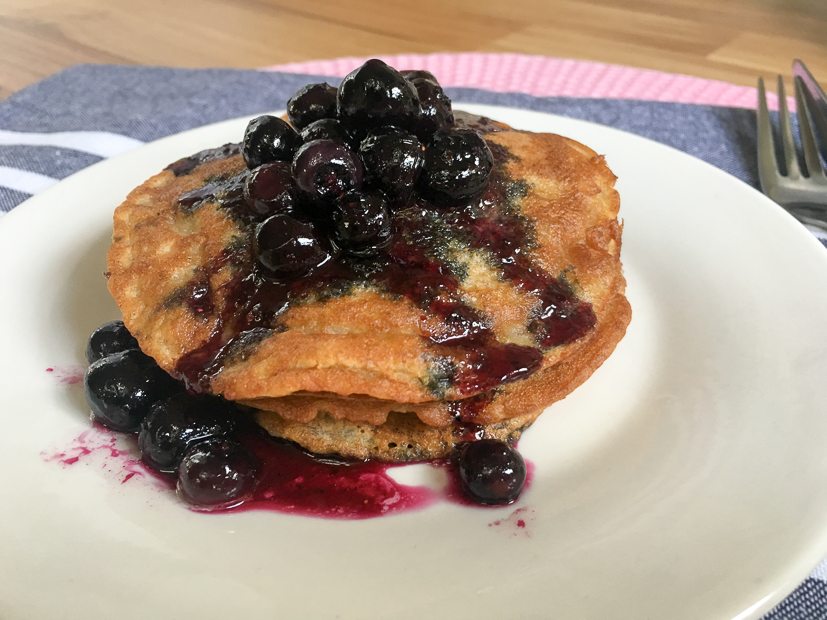 Ik maak havermout-pannenkoekjes (recept volgt) als ontbijt die ik serveer met blauwe bessen die ik even kort heb verwarmd met wat suiker, totdat het sap vrijkomt. Wat een heerlijk begin van de dag!