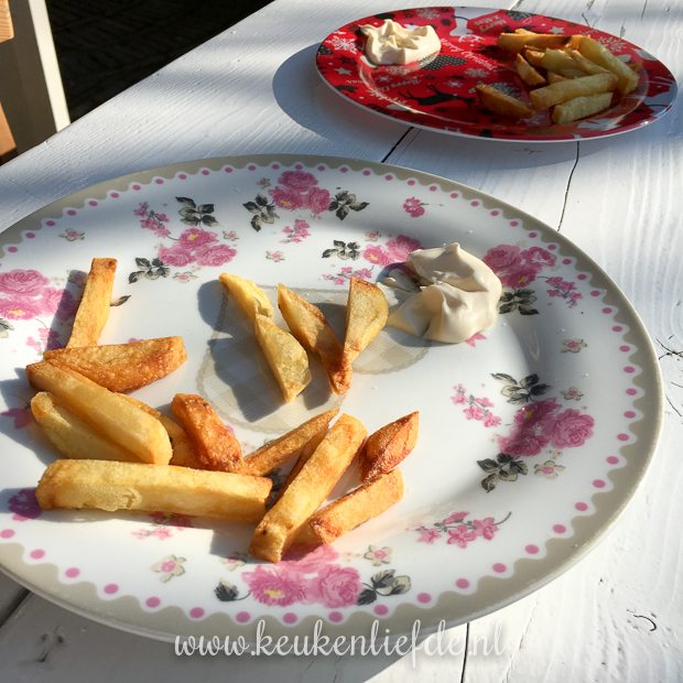 ’s Avonds eten we zelfgemaakte friet en een paar snacks waaronder mijn zelfgemaakte bamischijven. Uiteraard buiten in het zonnetje. Een heerlijke afsluiting van de week.