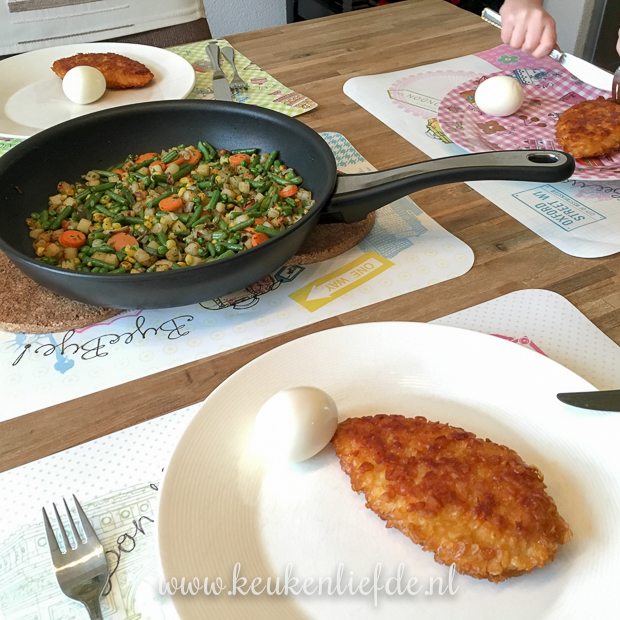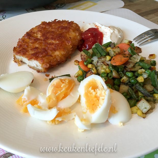 Ik heb niet zoveel inspiratie voor het avondeten. Ik koop een pak diepvriesgroenten die ik alleen maar hoef op te warmen en serveer die met gebakken kipschnitzels en hardgekookt ei. Niet echt culi maar wel lekker.