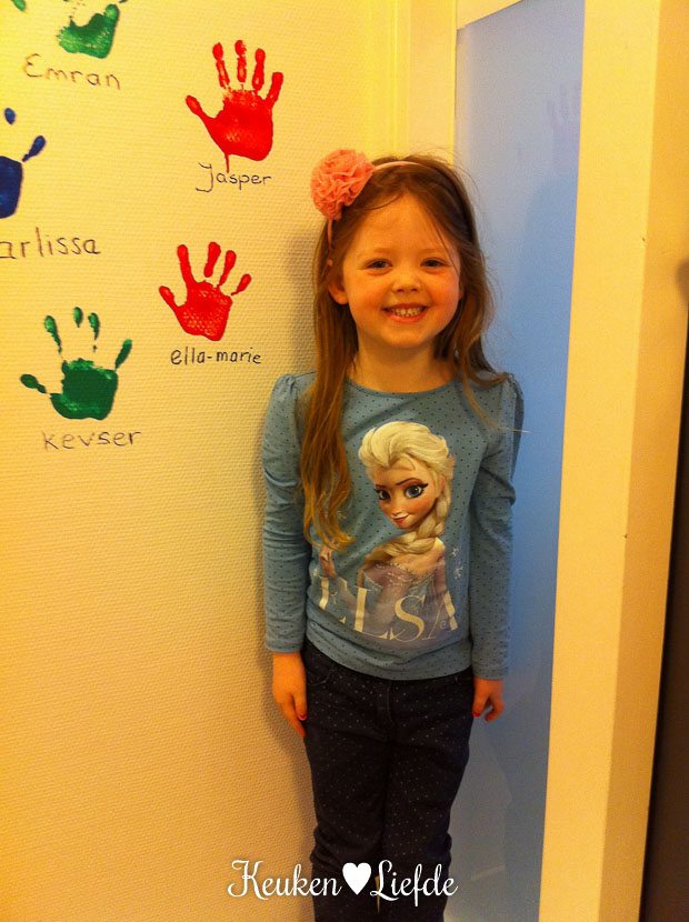 Ella-Marie heeft haar laatste logopedie-les en mag haar handje op de muur zetten. Zo trots als een pauw!