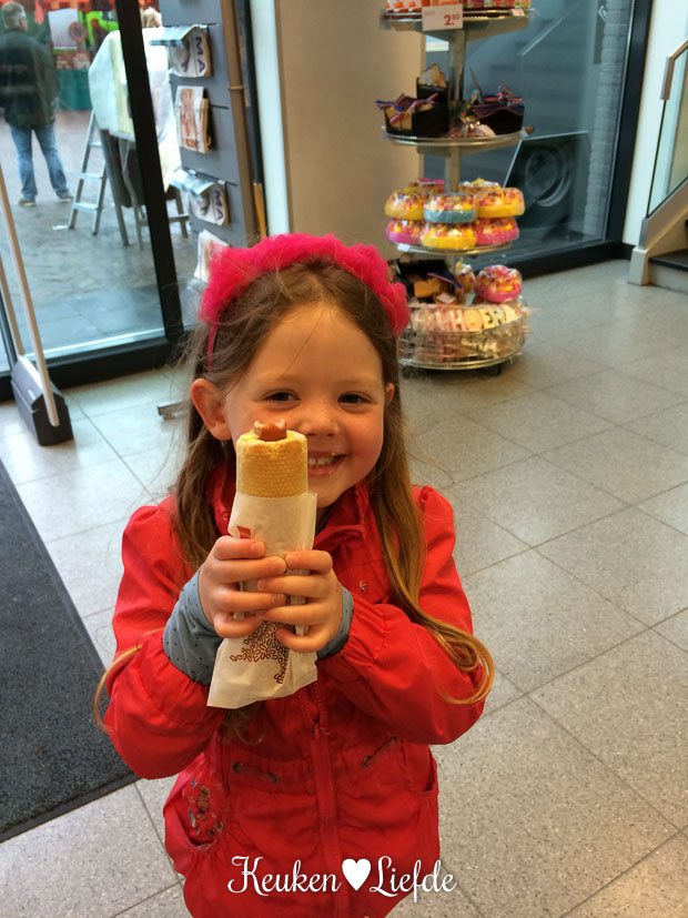 - Ella-Marie en papa scoren een broodje hotdog bij de Hema