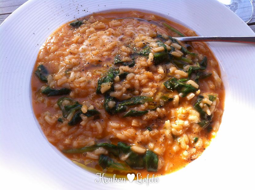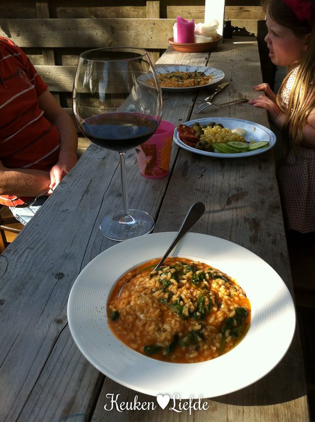 Ik had nog een restje spinazie in de koelkast liggen en besloot deze te verweken in een romige tomatenrisotto met mozzarella en Parmezaan. Wat een goede combi! Zowieso ben ik dol op risotto. Het is lekker, makkelijk om te maken en een perfecte restjesverwerker. We aten heerlijk buiten aan de bar.