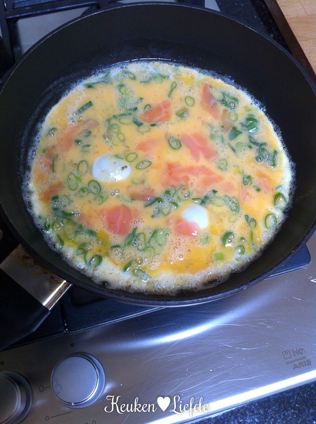 - Ik maak een omelet met zalm en lente-ui voor op brood