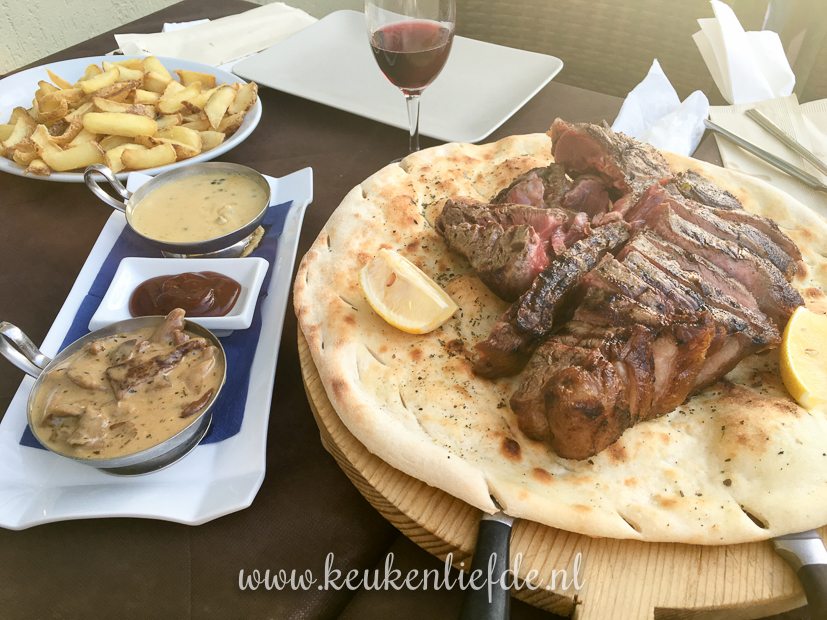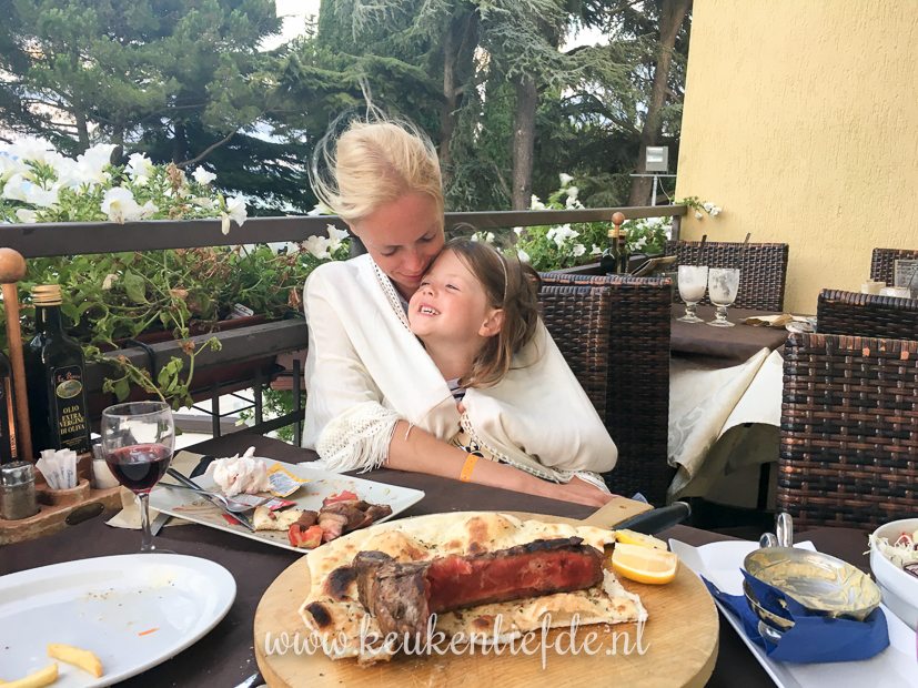 ’s Avonds gaan we op de camping uit eten. We hebben tomatenbruchetta vooraf en Bistecca alla Fiorentina als hoofdgerecht: een T-bone steak van de grill geserveerd op een pizzabodem.