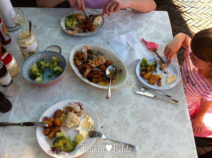 Als Johan thuis is, schuif ik de kip van gisteren in de oven en kook er nog wat verse broccoli bij. We eten lekker buiten in de tuin.