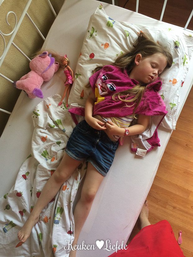 - Slapend op bed in haar Mega Mindy badcape en creme op haar neus gesmeerd.