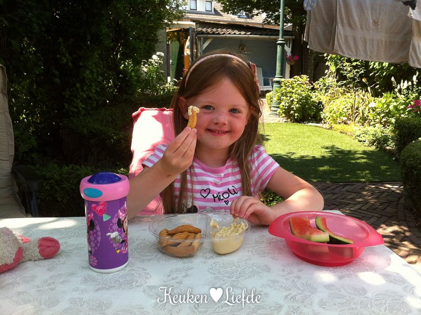 Twaalf uur. Ik haal Ella-Marie uit school. Ze heeft de komende zes weken vakantie! We lunchen met watermeloen en hoemoes dipper van Maza uit de goodiebag van Semilo. Lekker!