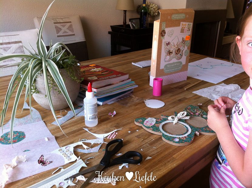 ’s Middags fietsen we naar de stad. We zijn nog op zoek naar een leuk cadeautje voor de oma van Johan en lopen bij de Kruidvat een fotolijstje tegen het lijf om zelf te versieren. Eenmaal thuis gaat Ella-Marie direct aan de slag. Het is een heel geknutsel, maar het resultaat is erg leuk. Daar zal oma vast heel blij mee zijn.