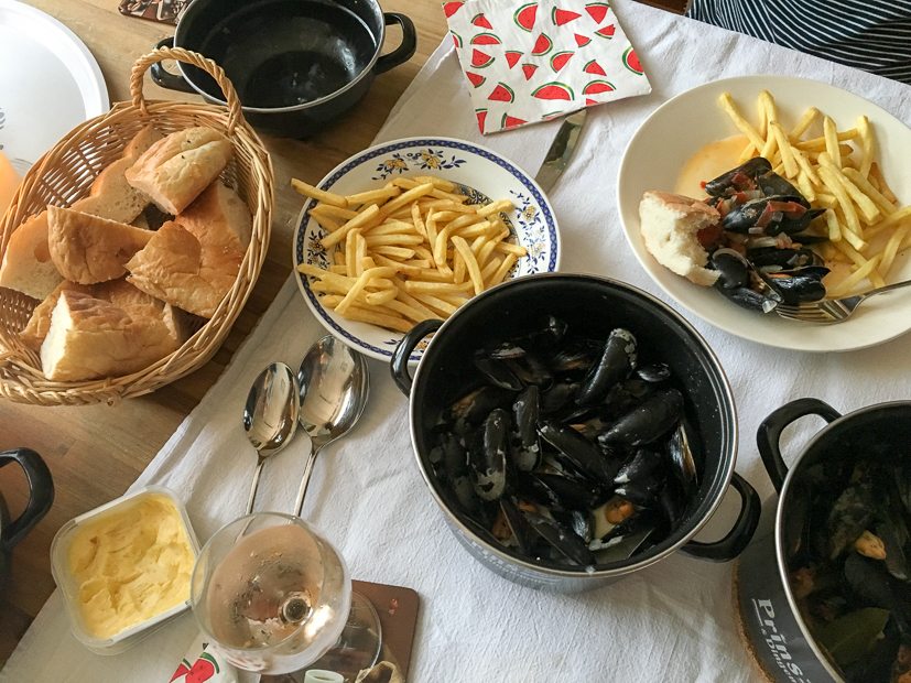 Johan kookt vanavond. Hij maakt twee bereidingen mosselen: een pannetje met chorizo en tomaat en een pannetje met romige roquefortsaus. Haha, drie keer raden wat mijn favoriet is!