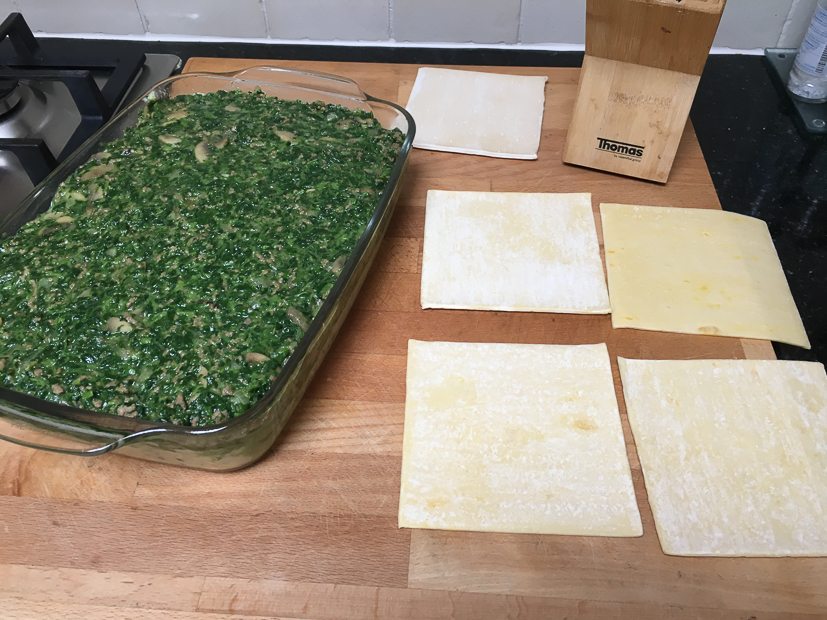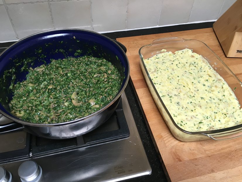 Weer thuis maak ik een spinazie-ovenschotel met gehakt en bladerdeeg. Ik voeg dit keer ook nog wat champignons toe.