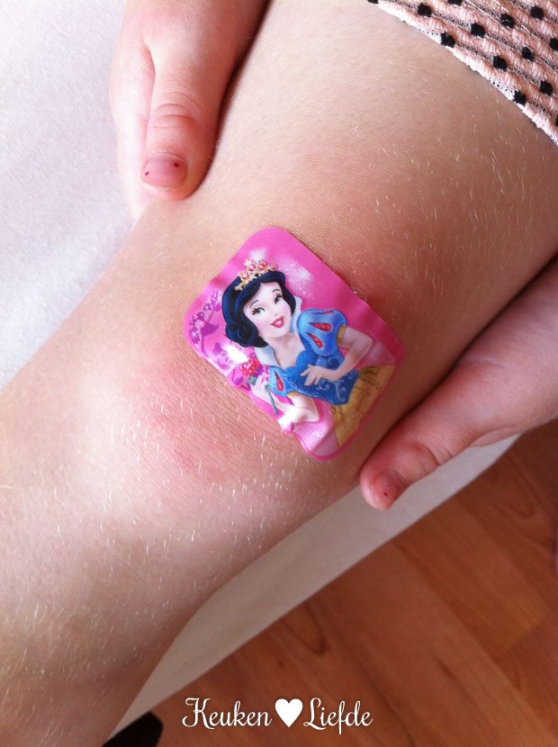 Au! Ella-Marie valt thuis met haar knie op de stoeptegels en is ontroostbaar. Gelukkig laat Sneeuwwitje haar pijn snel vergeten. Ze staat erop dat ik deze foto maak. 🙂