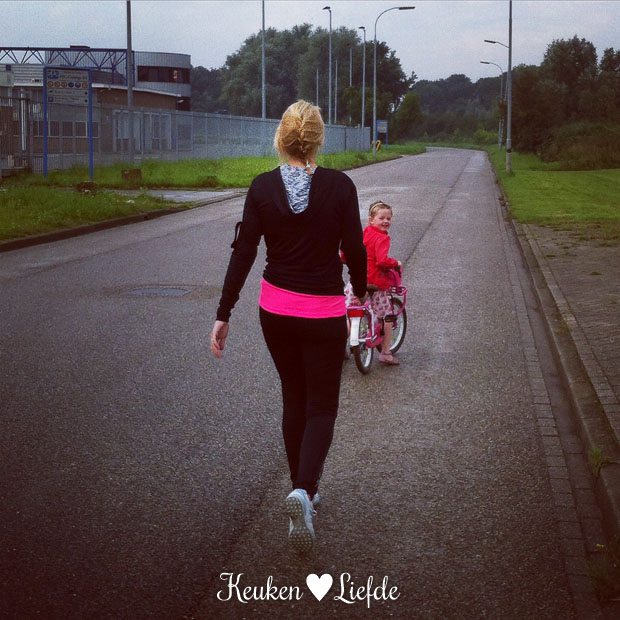 Na een heerlijk ontbijt op bed verzorgd door dochterlief, staat de hele familie om negen uur klaar in de startblokken. Johan en ik gaan hardlopen en El fietst mee. Zoals ik had verwacht is m’n conditie slecht en wandel ik meer dan ik hardloop. Ella-Marie moedigt me aan: “Kom op mama, pas erin. Jij wilde toch zo graag sporten, dan moet je wel een beetje doorlopen!” Naderhand voel ik me voldaan. Dit keer ga ik echt volhouden! Bovendien is het hartstikke leuk om met z’n drieën te sporten.