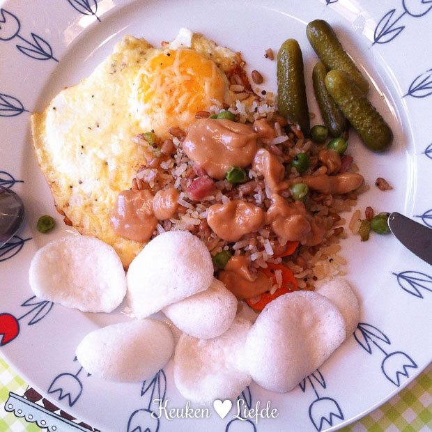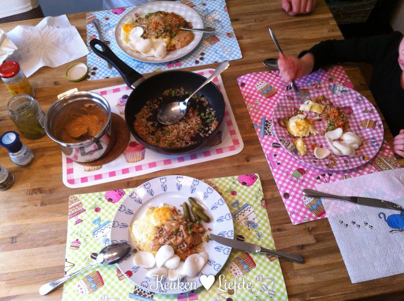Ik heb nog een restje gebakken rijst over van gisteren en samen met een paar gebakken eieren genieten we zo van een heerlijke kliekjesmaaltijd. Love it!