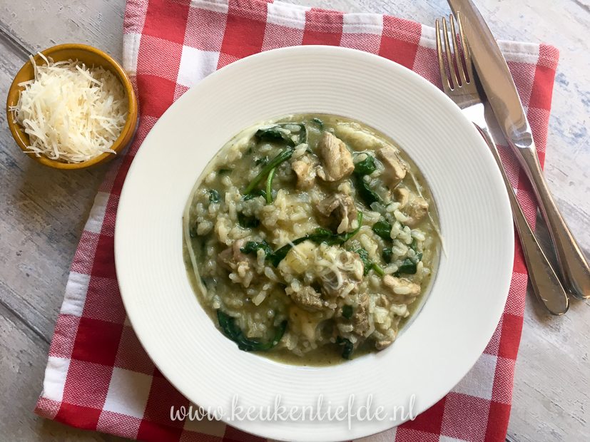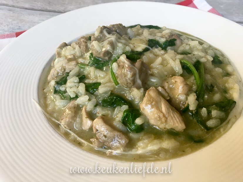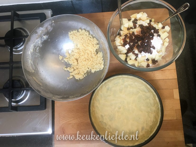 Ik bak appelkruimeltaart en maak risotto met pesto, kippendijen en spinazie.