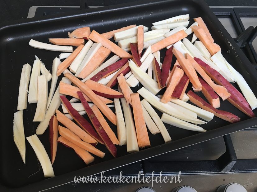 Haha, dat valt wel mee hoor Rianne. 🙂 Maar hoe meer je kookt, hoe meer inspiratie je krijgt. Hoewel ik ook weleens dagen heb dat ik totaal inspiratieloos ben. De groentefrietjes zijn eenvoudig: pastinaak, wortel, knolselderij, pompoen, zoete aardappel (of een combi daarvan), wassen, schillen en in frietjes snijden. Omhusselen met wat olijfolie en wat kruiden naar wens (bijv. chilivlokken, cayennepeper, tijm, paprikapoeder) en in voorverwarmde oven op 200 graden gaar en krokant bakken op een bakblik (niet te vol leggen). Daarna even laten uitlekken op keukenpapier en bestrooien met wat zeezout. Enjoy!