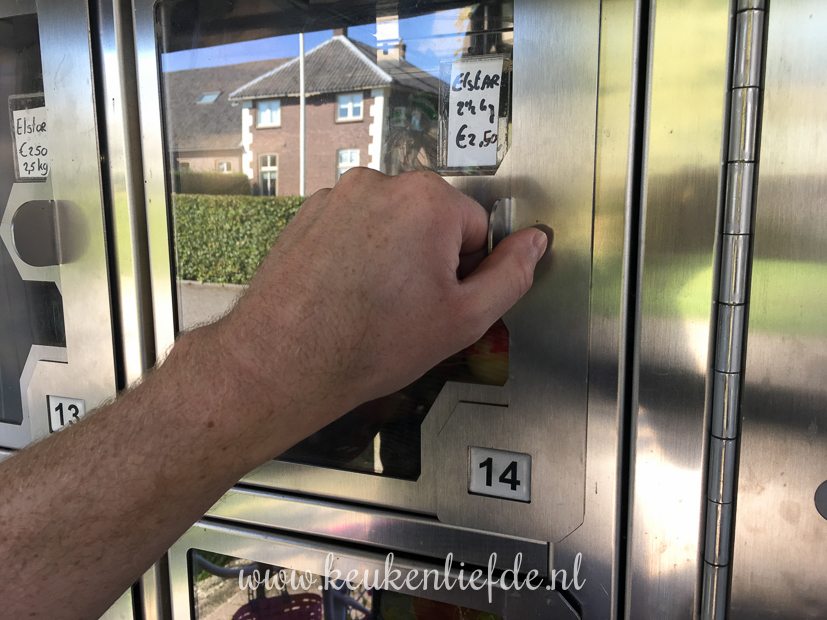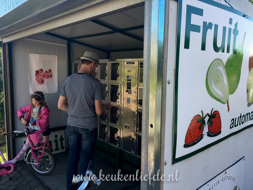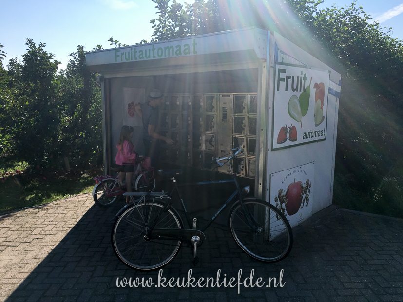 We gaan lekker een stuk fietsen. Onderweg komen we langs een fruitautomaat en trekken een zak Elstar.
