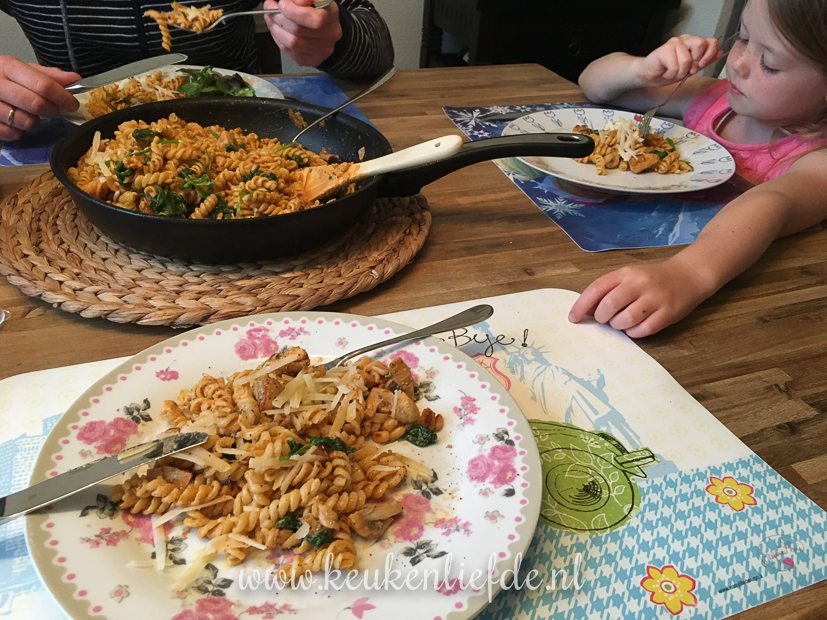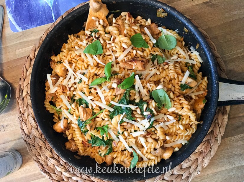Ik maak een lekker pastagerecht met rode pesto, kip en spinazie. Mmmm …