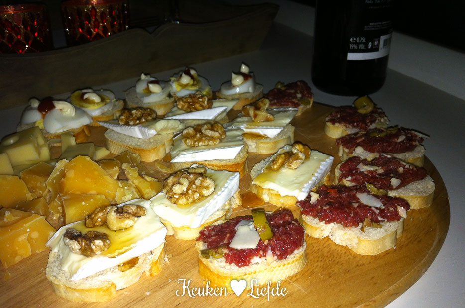 Als Ella-Marie ’s avonds op bed ligt, houden Johan en ik weer een filmavondje. Daar horen hapjes bij. Met een glaasje port dit keer. Op het plankje liggen stokbroodjes met hardgekookt ei, biefstuktapenade, brie met walnoot en honing, oude brokkelkaas en gatenkaas.