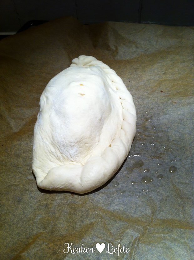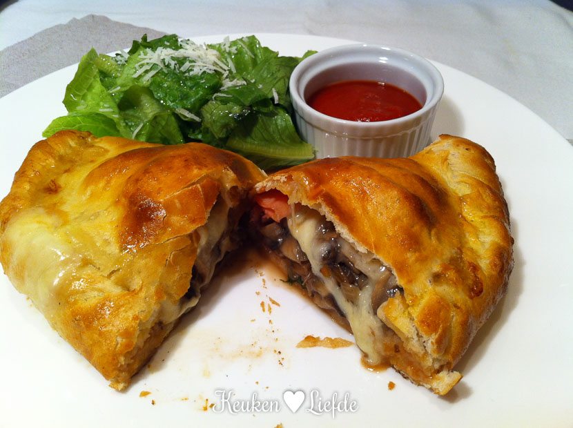 Ik maak voor Johan en mij een calzone: een dubbelgevouwen, gevulde pizza. Ik vul hem met ham en champignons. Wow, wat lekker! Die komt beslist vaker terug op het menu.