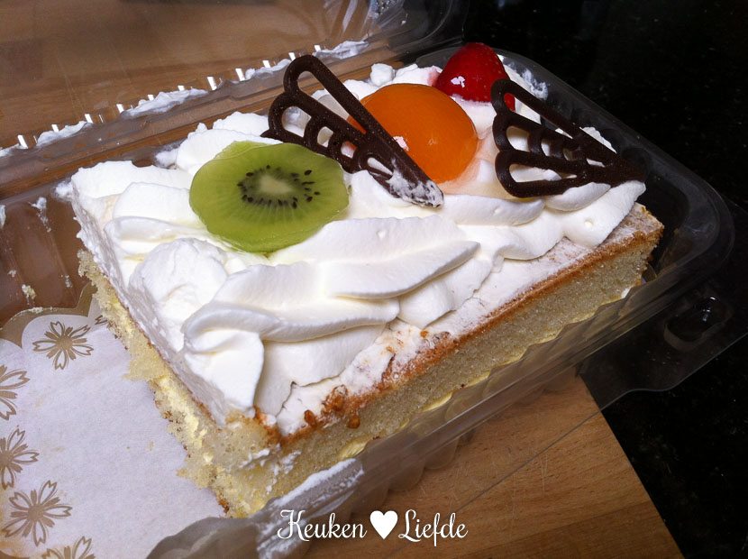Dit slagroomtaartje stond overigens niet op het briefje, maar mijn naam stond erop geschreven. Zodra ik thuis de boodschappen heb opgeruimd snijd ik een flinke homp af. Zo, dat heb ik wel verdiend.