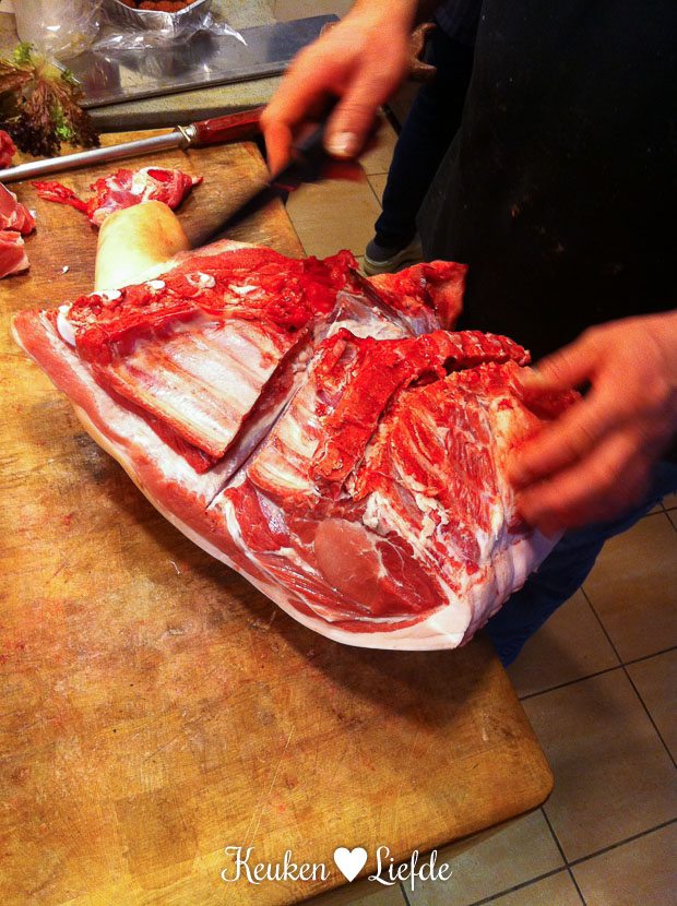Ik breng een bezoekje aan de slager, want ik heb een stukje vlees besteld. De slager roept me achter de toonbank en laat me zien wat voor vlees ik in de kuip heb: een varkensschouder met bot van vierenhalve kilo. Wat ik hiermee ga maken, hou ik nog even als verrassing. Wordt binnenkort vervolgd …