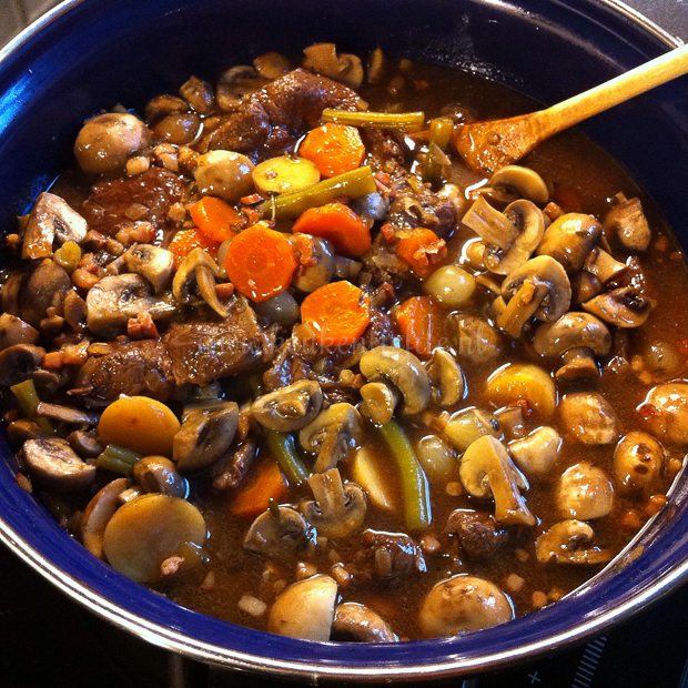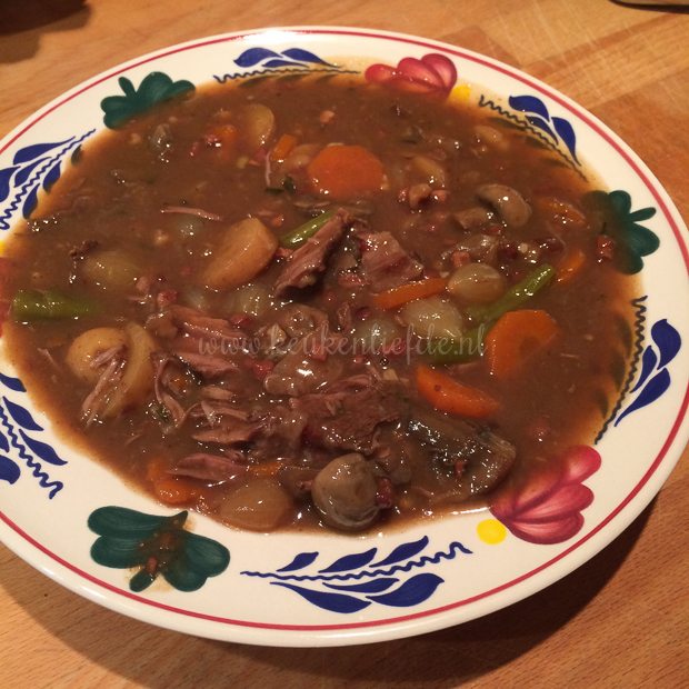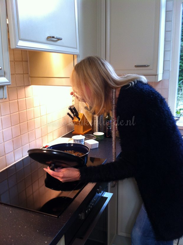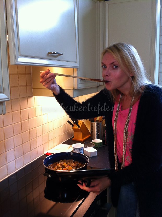 Om negen uur ’s ochtends sta ik het stoofvlees te proeven, dat moeders gisteravond in alle rust verder heeft laten garen. Het vlees is inmiddels boterzacht en valt mooi uiteen. Precies zoals we willen!