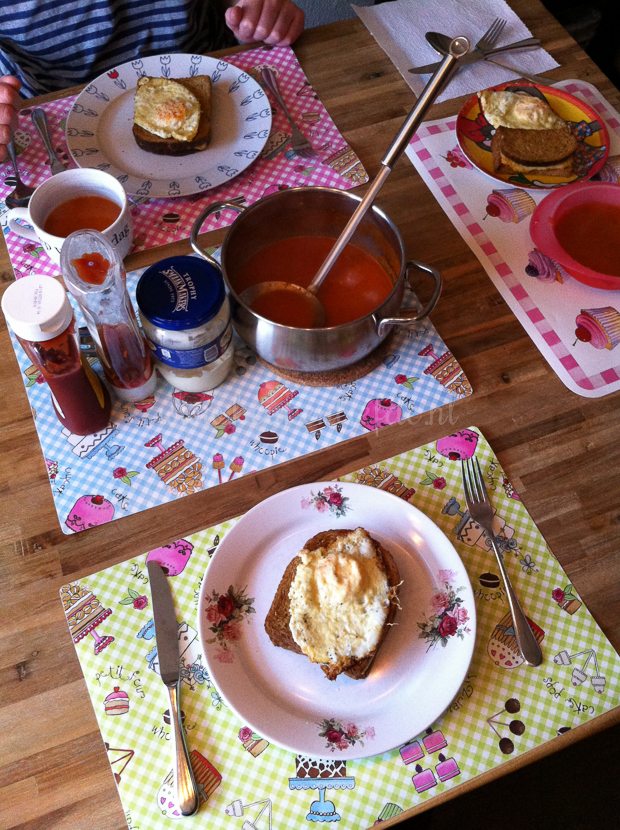 Als we thuiskomen is papa in de keuken met het avondeten bezig. Op het menu: knapperige kaastosti’s uit de oven, gebakken eieren en tomatensoep. Ella-Marie springt een gat in de lucht.