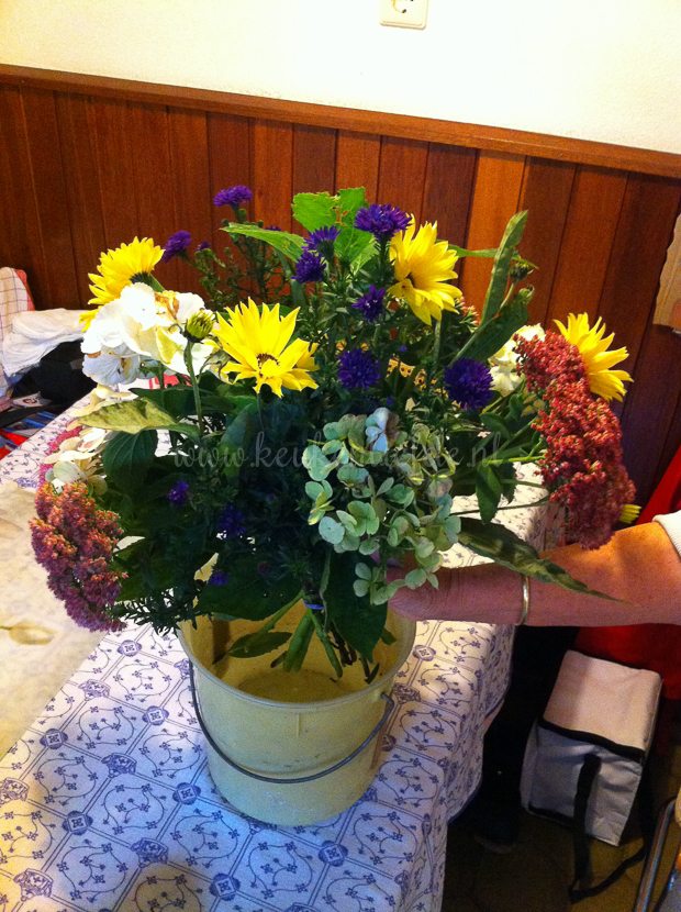 Als ik naar huis ga krijg ik weer een prachtig boeket mee van moeders, geplukt uit haar eigen tuin.