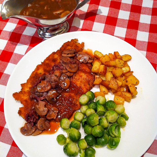 Voor het avondeten pak ik uit met een nieuwe Mieks Special. Ik maak zelfgemaakte kipschnitzels met jachtsaus en serveer daarbij gebakken aardappels en spruitjes. Wat was dat lekker!