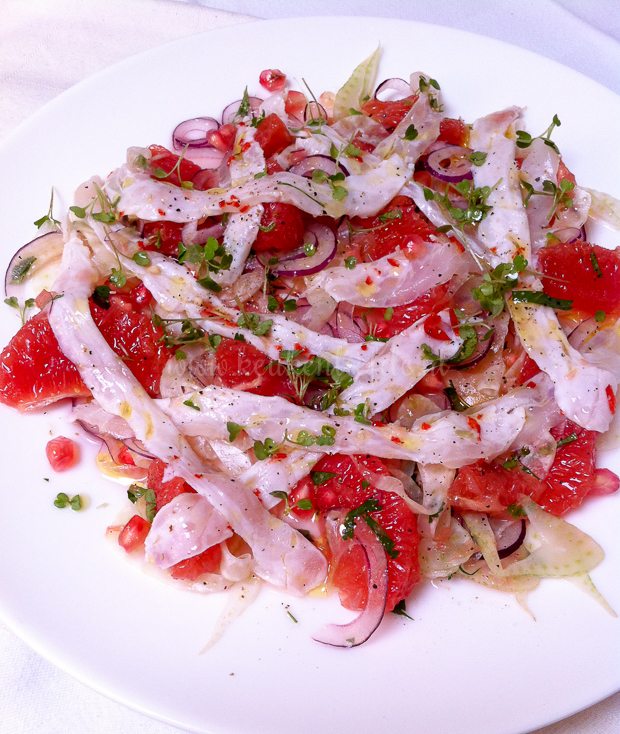 Ik bereid een lekkere zeebaars ceviche als lunch en gebruik daarvoor de granaatappel die Johan eerder deze week kreeg.