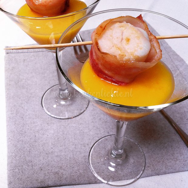 Ik maak alvast een feestelijk recept om tijdens de kerst te serveren als amuse of voorgerecht: een smakelijk hapje met mango, coquilles en spek.