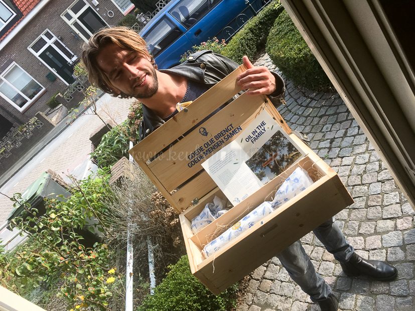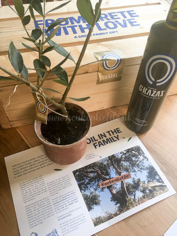 Deze aardige jongeman van Gkazas Olijfolie staat op de stoep met wel een heel leuk kistje: een mini-olijfboompje en fles olijfolie! Ze staan symbool voor onze eigen olijfboom in de bergen van Kreta op het landgoed van de familie Gkazas. We krijgen de boom ’te lease’ en de opbrengst is voor ons. Hoe leuk is dat! Ik mag trouwens ook zo’n kistje weggeven aan een KeukenLiefde-volger. Houd onze facebookpagina goed in de gaten, want hier ga ik binnenkort de winactie delen.