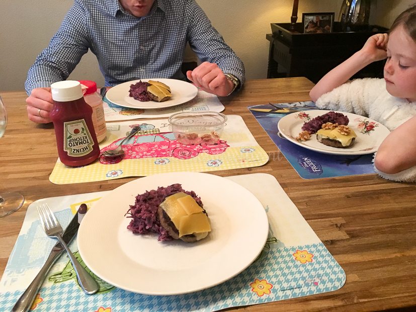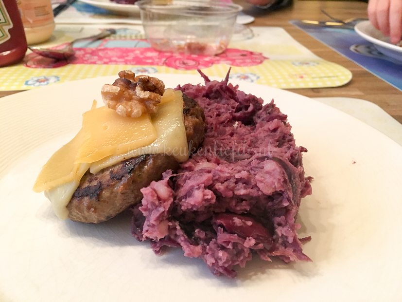 Vanavond eten we rodekoolstamppot met hamburgers. Of eigenlijk zijn het cheeseburgers want ik legde er een plakje kaas op.
