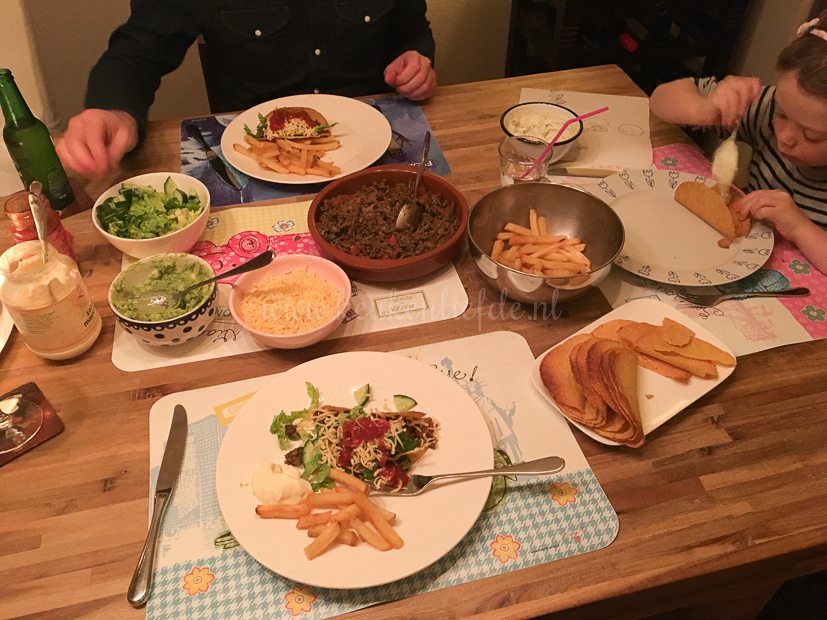 Ik heb ’s avonds niet zoveel zin meer om te koken dus Johan duikt de keuken in. We eten taco’s met gehakt en allemaal lekkere dingen erbij zoals guacamole, zure-roomdip, sla, geraspte kaas, salsasaus en ovenfrietjes. Mmmm … Feestmaal!