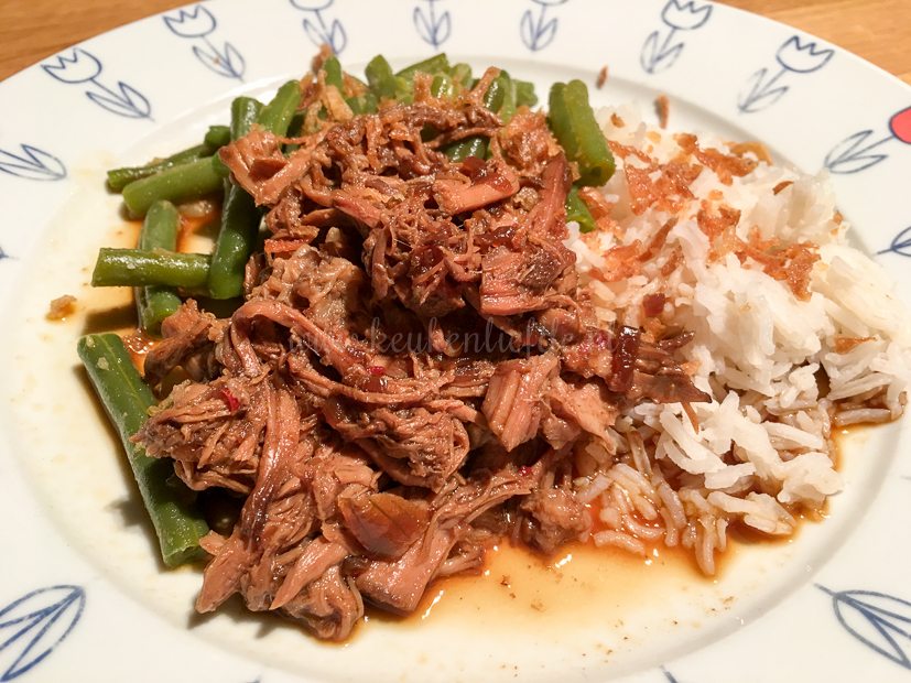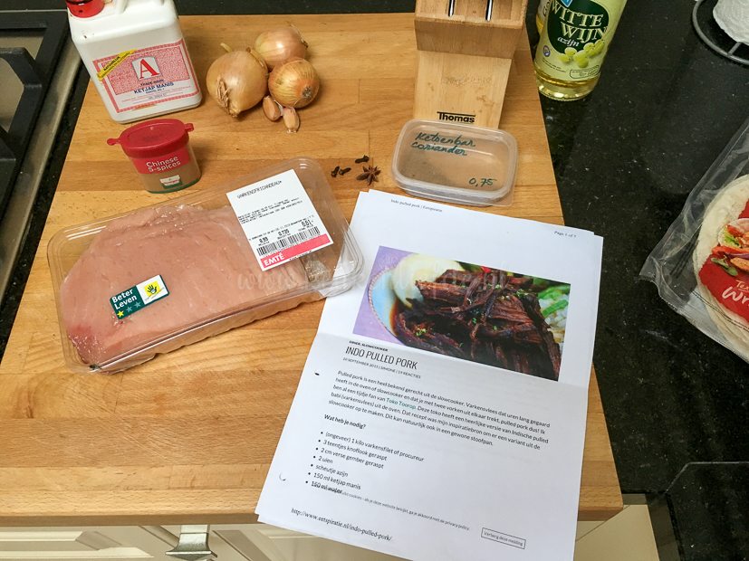 Ik ga direct aan de slag met mijn slowcooker. Ik kan geen seconde langer wachten! Anke gaf me een recept mee van Eetspiratie voor Indo pulled pork en dat lijkt me heerlijk. In plaats van procureur (zoals aangegeven in het recept) kies ik voor fricandeau. Die ligt namelijk in de supermarkt en lijkt me ook wel geschikt. Scheelt me bovendien weer een ritje naar de slager. Heb ik je al verteld dat ik lui ben …?