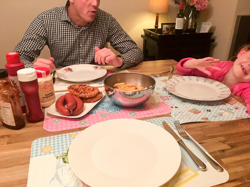 Heb je ooit zo’n hoopje ellende gezien? Ik niet! Dit is duidelijk niet mijn dag. Uiteindelijk eten we frietjes met kipschnitzel en bockworst. Zucht.