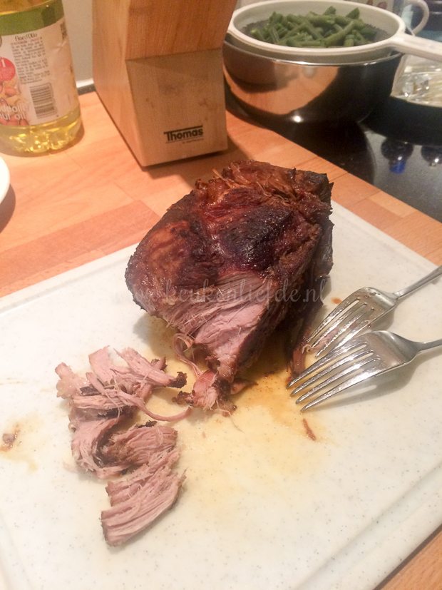Ik ben vastbesloten om het project slowcooker te laten slagen. Ik maak alsnog het ritje naar de slager om de procureur te halen. Jihaaaaaa! ’s Avonds word ik beloond met zalig zacht en mals pulled pork!