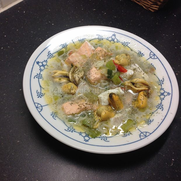 Mijn moeder stuurt me deze foto door van haar avondeten. Ze had nog wat gekookte mosselen over van gisteren en met wat extra zalm en schelvis erbij maakt ze een verrukkelijk vissoepje met kokosmelk en noedels. Liefhebbers voor het recept? Laat het me weten, dan deel ik het wellicht.