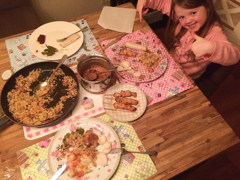 Het avondeten is een makkie. Ik warm de overgebleven nasi goreng van zaterdag op. Erbij eten we zelfgemaakte kipsateetjes en mini loempia’s uit de Airfryer.
