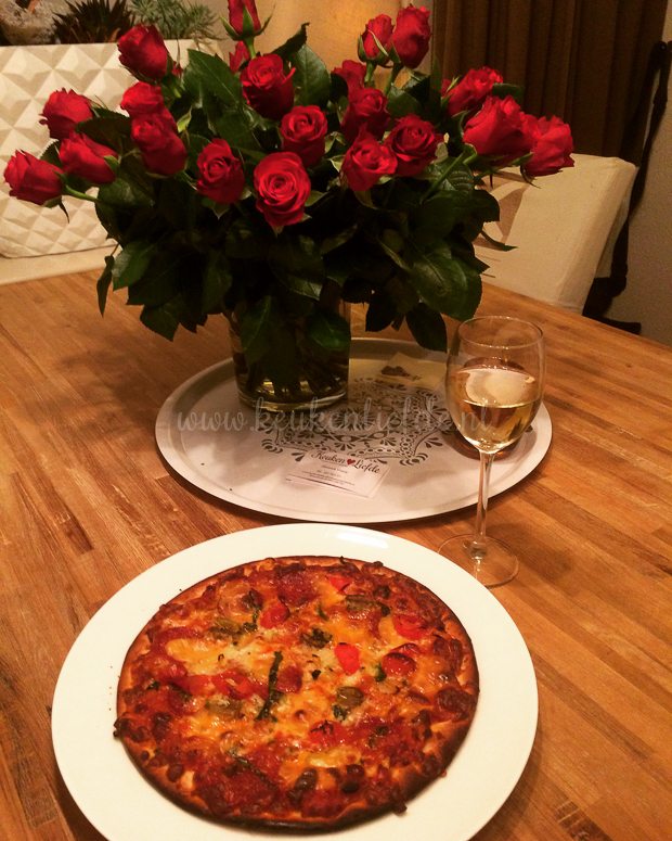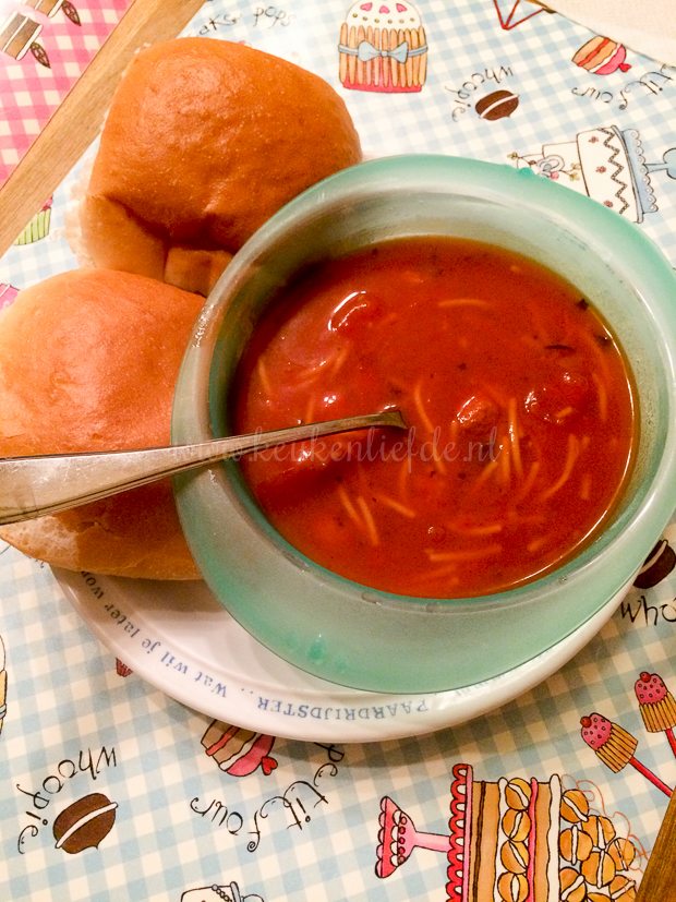 Ik heb nog geen flauw idee wat we moeten eten vanavond en heb ook niet zo veel zin om te koken. Tijdens het boodschappen doen laat ik me verleiden tot het kopen van drie kant-en-klare margherita pizza’s, een blik tomatensoep en een zak met bolletjes. Natuurlijk kunnen ze niet tippen aan zelfgemaakte pizza en tomatensoep, maar smaken doen ze best. De pizza’s beleg ik overigens extra met kaas, tomaat, rode ui, chorizo en voor Johan jalapeño peper.