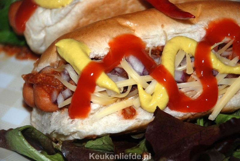 Amerikaanse Chili dog (hotdog met chili)Dit keer een Amerikaanse topper, de chili dog! Gewoon een simpel broodje hotdog bedekt met een laag pittige chili en bestrooid met fijngesneden rode ui, geraspte kaas en wat mosterd en ketchup.